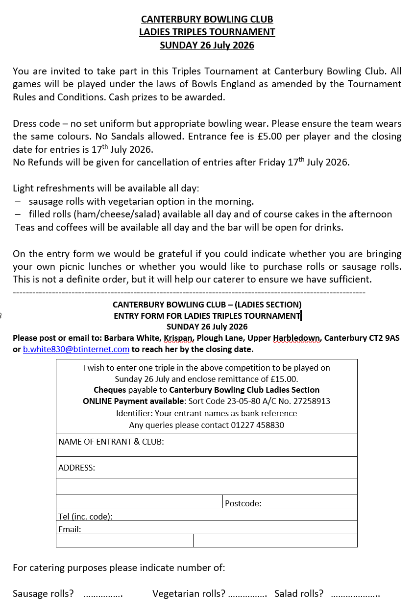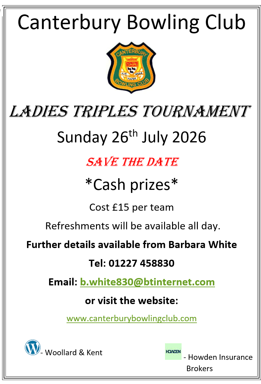 Following on from very successful and enjoyable Ladies Triples competition held in 2025 we have fixed the date for this year's event as Sunday 26 July 2026